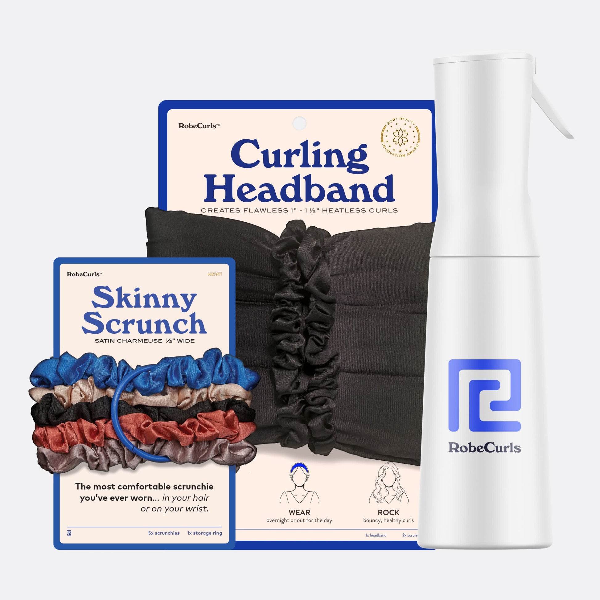 We invented the heatless curling headband and put together the perfect Must Haves Bundle to help you start your heatless curls journey with everything you need! The bundle includes RobeCurls® The Original Heatless Curling Headband™, 5-pack Skinny Scrunch™, and Mr.Spritzer™. With a perfect blend of fashion and function, RobeCurls® creates effortless heatless curls that last 5x longer. Simply wrap, wear, and rock - anytime, anywhere!