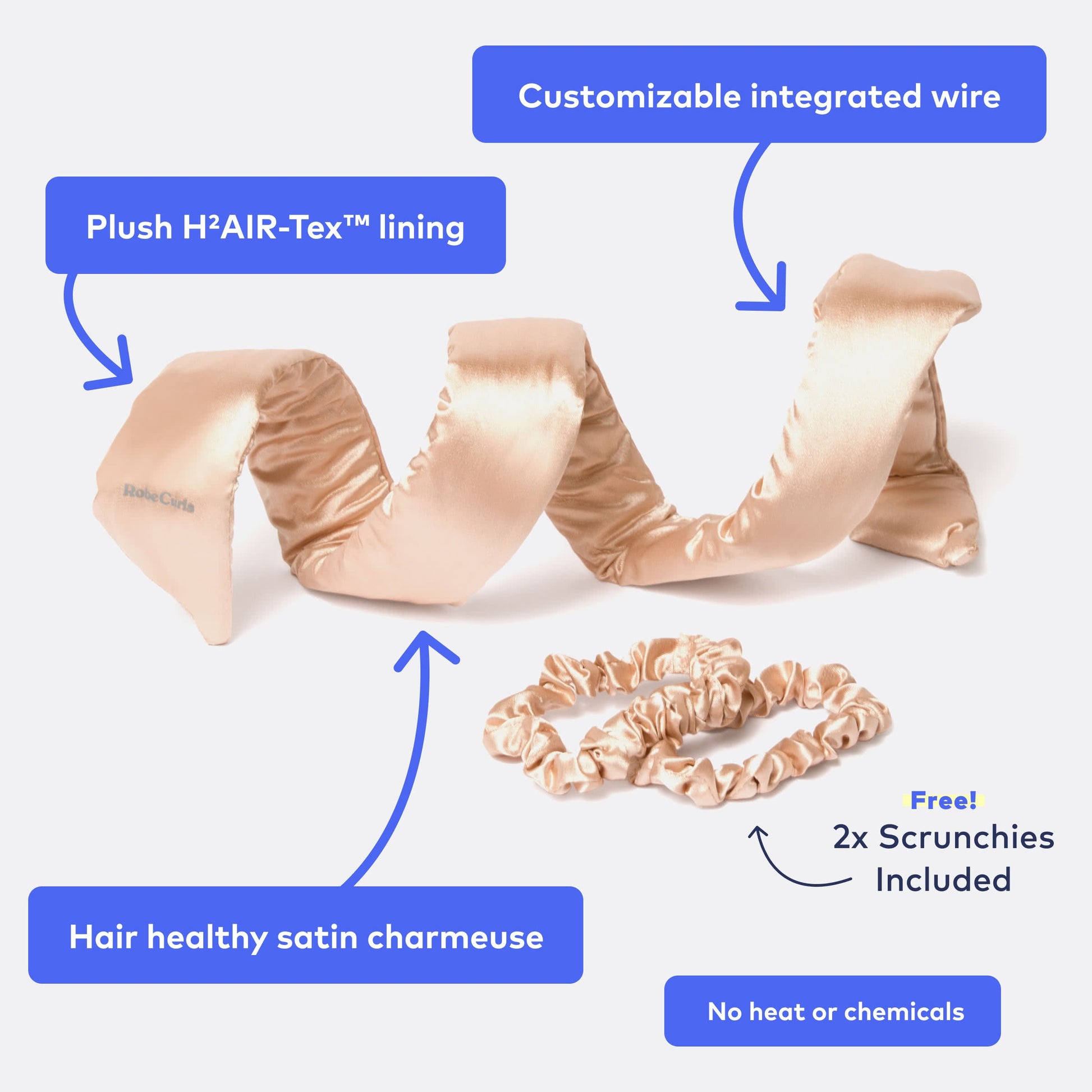 Introducing the Original Heatless Curling Headband™ by RobeCurls®, a revolutionary hair curler designed for effortless and healthy hairstyling. Invented by Emily Kenison, this patented and award-winning product is ideal for achieving customizable curls without heat damage. Its unique design features an integrated wire in a soft, pillowy material, allowing you to easily adjust the size of your curls. Crafted from premium satin charmeuse with a proprietary H²air-Tex plush lining, it ensures longer-lasting curls while being gentle on your hair.