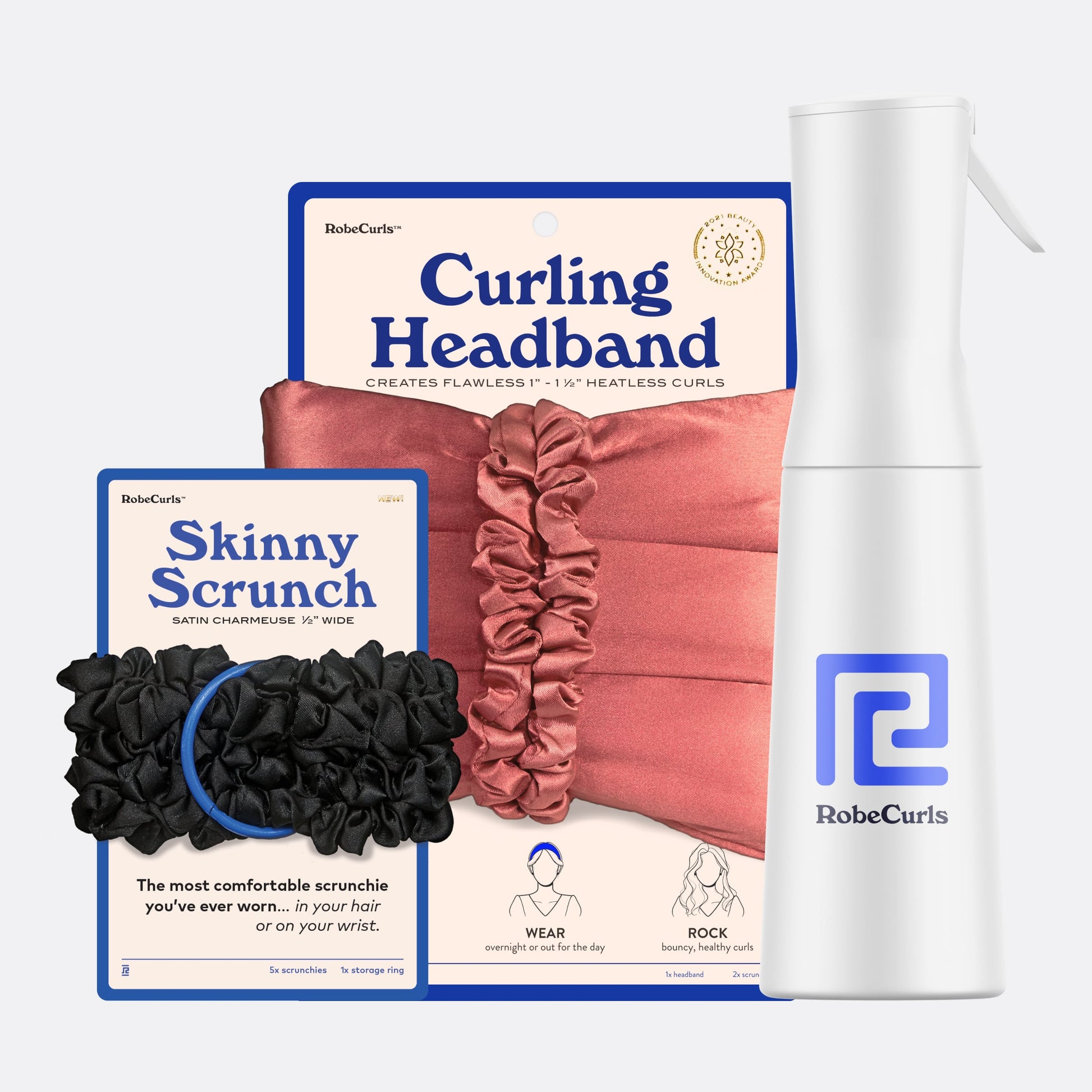 Together, the Curling Headband™, Skinny Scrunch™, and Mr. Spritzer make an ideal combination for achieving beautiful, long-lasting curls with ease and comfort.Try our bundle today and experience the magic of heatless curls with RobeCurls®.